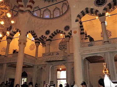 さらに、モスク内部にはいくつもの色鮮やかなステンドグラスが使用されており(右下写真)、光が差すとそれらが美しく輝きます。