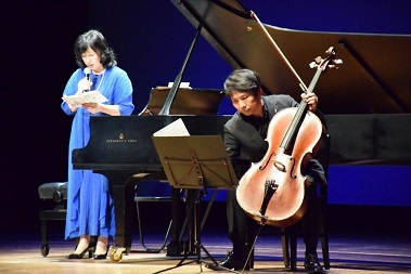前半のコンサートでは、クラシックの名曲の数々を、崔 善愛(チェ・ソンエ)さん(ピアノ)と三宅 進さん(チェロ)が美しいハーモニーで奏でました。